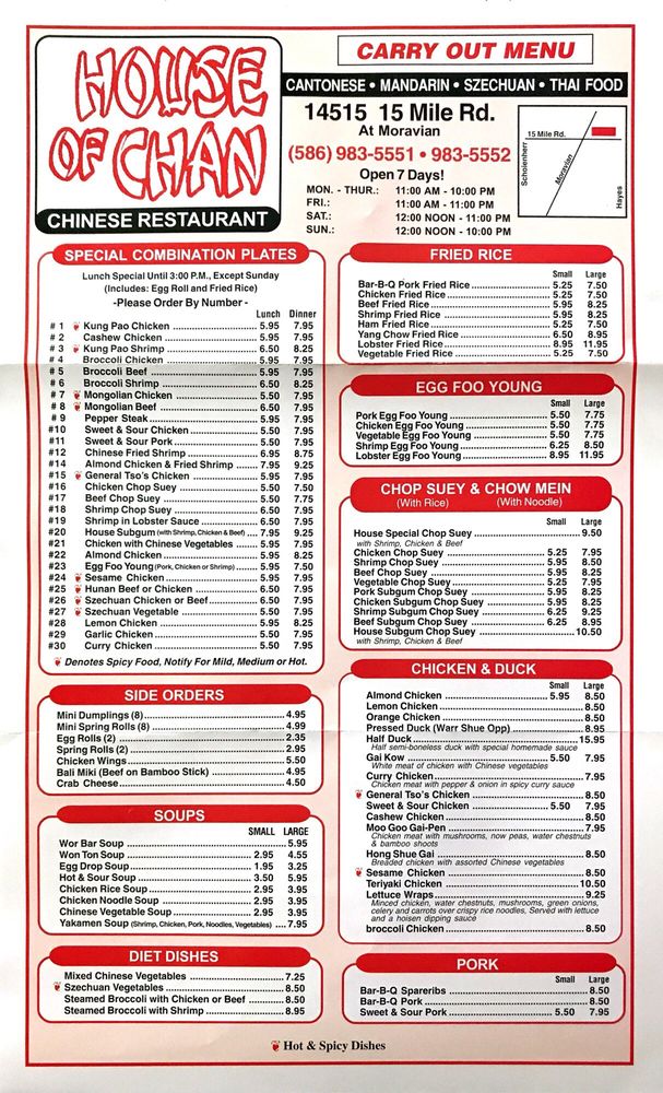 Welcome to House Of Chan, a Chinese restaurant located in Sterling Heights, MI. This establishment offers a wide range of amenities, including delivery, takeout, catering, and even private dining options. The menu at House Of Chan features mouthwatering appetizers like BBQ Spare Ribs and Cajun Fries, as well as traditional combo plates such as Almond Chicken and Beef Chow Mein. Customers rave about the delicious food and generous portions, with favorites like Sesame Chicken and Kung Pao Shrimp receiving high praise. The friendly staff and efficient service make dining at House Of Chan a delightful experience. Whether you're a longtime fan or a first-time visitor, this restaurant is sure to impress with its flavorful dishes and inviting atmosphere.